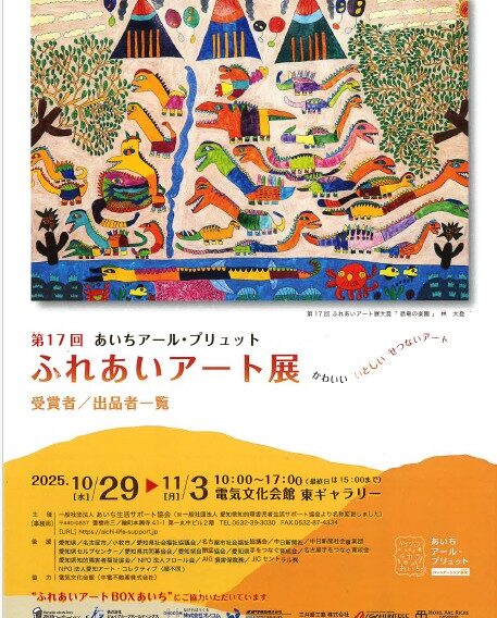 ふれあいアート展 2025年10月30日 10月29日(水)から11月3日(月)まで、電気文化会館 東ギャラリー(伏見)にて開催されます『ふれあいアート展』にて、 名東福祉会から13名の作品が展示されています。 是非ご観覧ください。 Categorised in: アート(創作活動), ブログ written by 事務センター コメントを残す コメントをキャンセルメールアドレスが公開されることはありません。 ※ が付いている欄は必須項目ですコメント ※ 名前 ※ メール ※ サイト 次回のコメントで使用するためブラウザーに自分の名前、メールアドレス、サイトを保存する。 上に表示された文字を入力してください。 <<前の投稿へ
