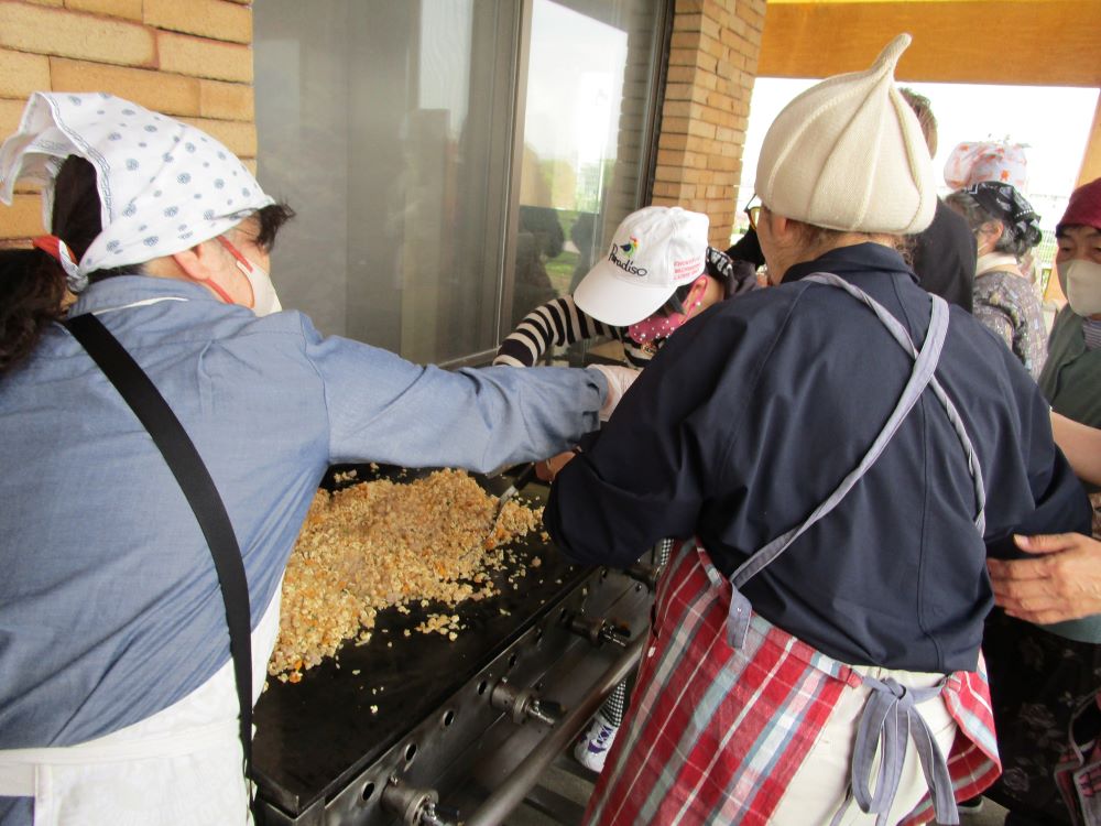 焼きそばやチャーハンを焼く、適量を上手にパック詰めしてくれるなど家族会の方々と協力して