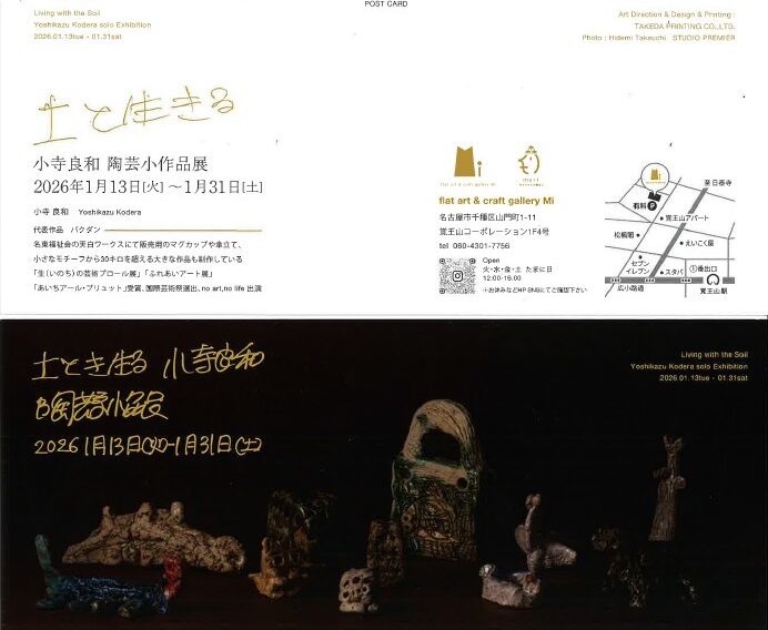 小寺良和 陶芸小作品展 2026年1月21日 1月13日(火)から1月31日(土)まで、flat art & craft gallery Miにて開催されております 『小寺良和 陶芸小作品展』の様子です。 是非ご観覧ください。 Categorised in: アート(創作活動), ブログ written by 事務センター コメントを残す コメントをキャンセルメールアドレスが公開されることはありません。 ※ が付いている欄は必須項目ですコメント ※ 名前 ※ メール ※ サイト 次回のコメントで使用するためブラウザーに自分の名前、メールアドレス、サイトを保存する。 上に表示された文字を入力してください。 <<前の投稿へ