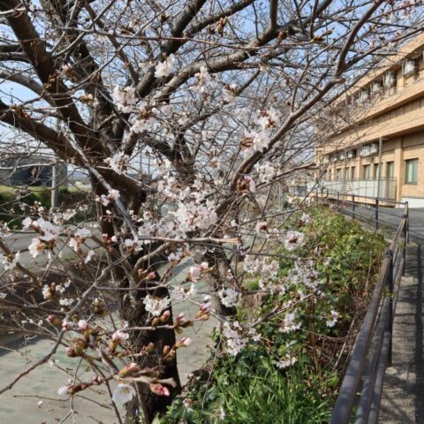 レジデンス日進と歩道の間の桜が咲き始めました。毎年、同じ時に咲いて春を感じさせて...